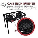 An Outdoor Staple of Outdoor Cooking As in all in one cooking system, our High-Pressure Propane Double burner is an essential staple of outdoor cooking. Constructed with two robust cast iron burners capable of emitting high heat output, it can grill, boil, steam, and fry. Built with 4 detachable legs it is easily put together and stored. Comes included is a steel-braided high-pressure regulator that allows for precise control over flame, and windscreen that provides added protection from the wind.