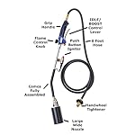 This torch puts out 340,000 BTU, making it a great choice for heavy duty jobs around the home. The handle is easy to grip and valve comfortable to squeeze. A 6 foot hose is included in order to provide extra reach. Works with standard liquid propane, and can be attached to cylinders from 5 lbs up to 40 lbs.